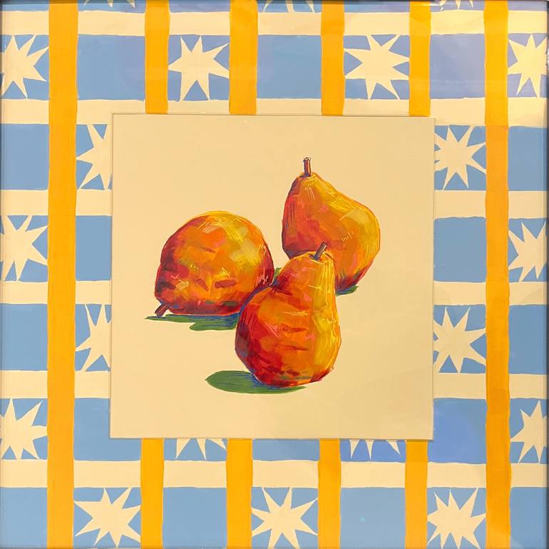 Three pears in vibrant hues paired with a custom painted mat for a joyful arrangement that will brighten up any space. This piece can come in the grey 2in deep frame shown in the second photo or without based on preference.