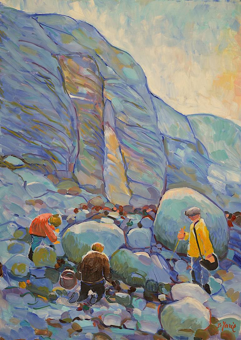 Au petit matin, les pécheurs se précipitent pour ramasser des crustacés dans les flaques d'eau restantes de la précédente marée. Toile réalisée à partir de dessins et réalisée en atelier. . ...