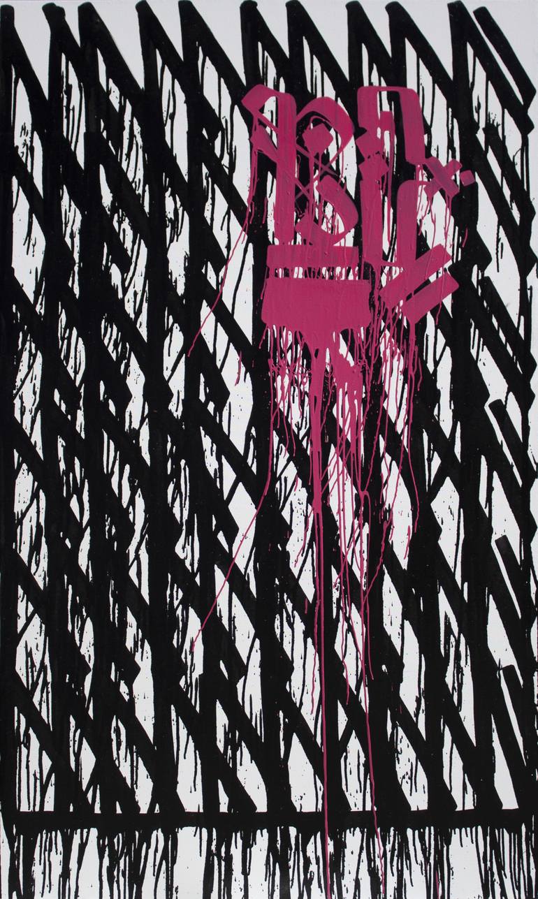 Industrial and acrylic enamel on primed fabric. The artwork is ready to hang in your new home. Piece inspired by the harsh experiences of the people who live on the outskirts of Mexico City, taking as reference the "tags" that abound in these areas. The piece forms repetitions of the same "tag", to...