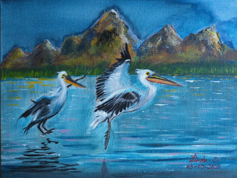 "Pelican" is my original acrylic painting on canvas panel, size: 14"x11"x0.2" Those two pelicans just like a baby was training by a parent on water. It is a very pretty piece for art lover and collector. Also can be a nice gift to your friends, family members for their birthdays, and holidays. It is...