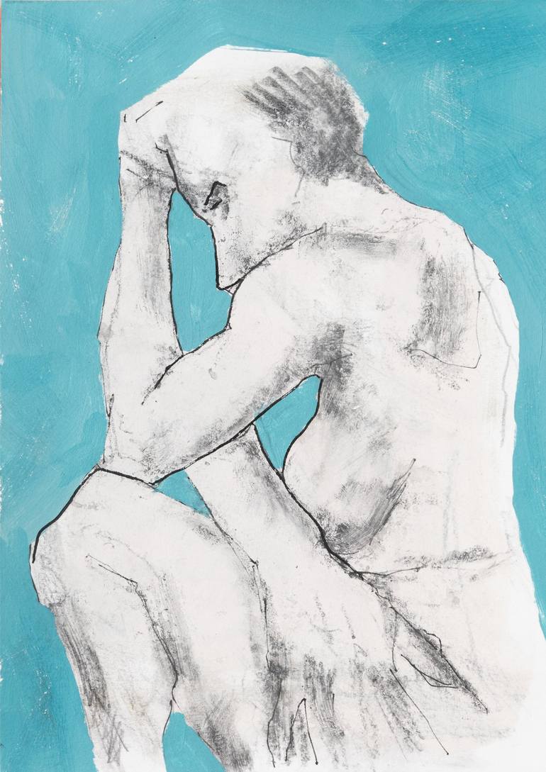 Holding their head in their hands, and their head tilted down this work evokes times of deep personal introspection and contemplation. Style: figurative, expressionism, portraiture, fine art, contemporary. Subject: portrait, people, nude, body, mental health, mind. Medium: acrylic, ink, pencil. Sur...