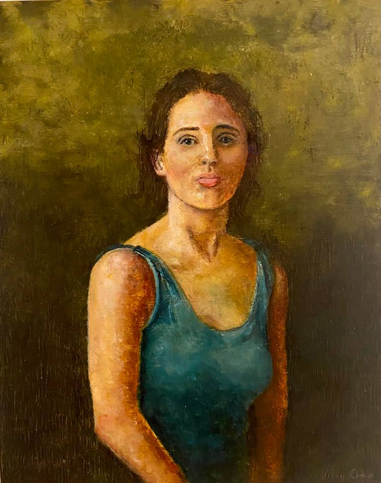While visiting art galleries in Europe the idea came to me to paint a portrait like the great masters. I hope one will feel the reflection and serious thought of this woman. I painted this on wood with oil paints as the grain gives the texture needed.