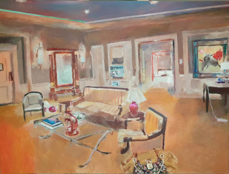 This painting conveys the uncanny feeling one can get when staying alone in a hotel room. In this case the interior space is rich and opulent; full of luxurious traditional furnishings rendered in a warm colour palette. But when one examines the room closer they will notice a lamp pushed off a tab...