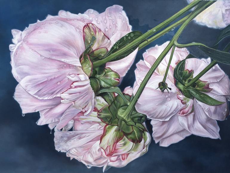 Peonies are one of the most elegant flowers that exist. In this oil painting my goal was to capture their undeniable beauty as they were being pressed down by passing rain. I was enamored with how beautiful the rain drops sat on the translucent pink petals and I wanted to recreate it larger than li...
