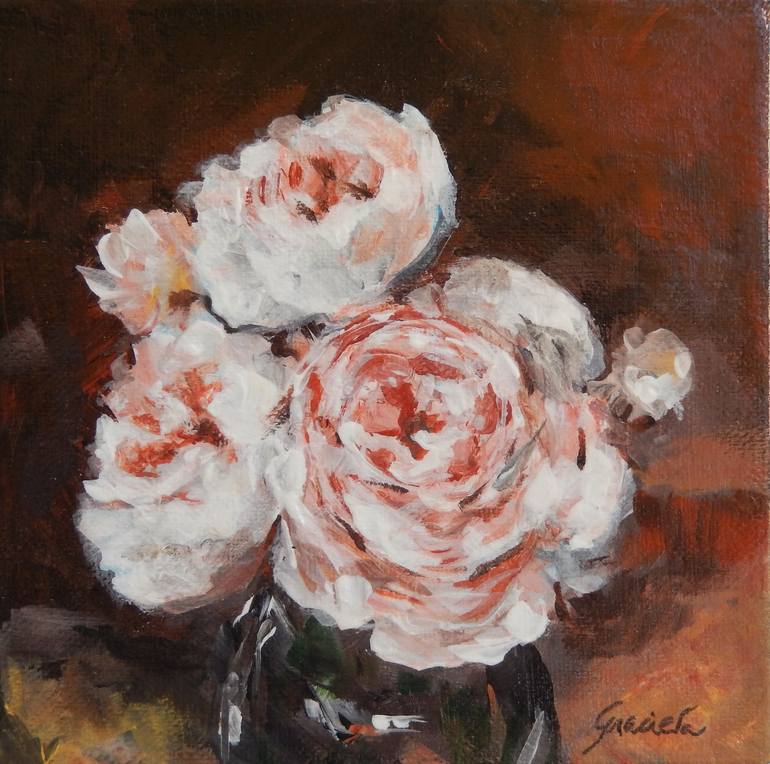 White and rose peonies in a black vase. Acrylic paint with a gloss finish. Gallery wrap and ready to hang. Enjoy!