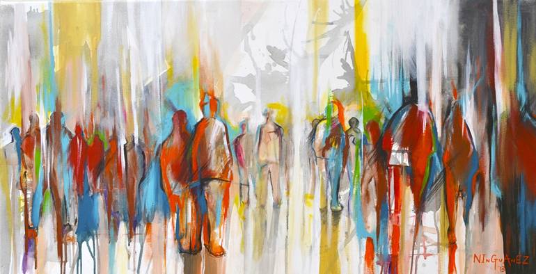 The painting invites the viewer to be a part of the procession of people walking into the plane of the canvas. The vagueness of this semi-abstract piece allows for a multitude of narratives, making it a happening and a journey; the destination is yet to come.
