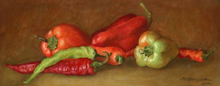 This watercolor painting is inspired by the vibrant colors and natural juiciness of fresh peppers. Created from life using the classical multilayered watercolor technique, the artwork highlights an assortment of green, red, and orange peppers, their bold hues and textures captured with meticulous de...