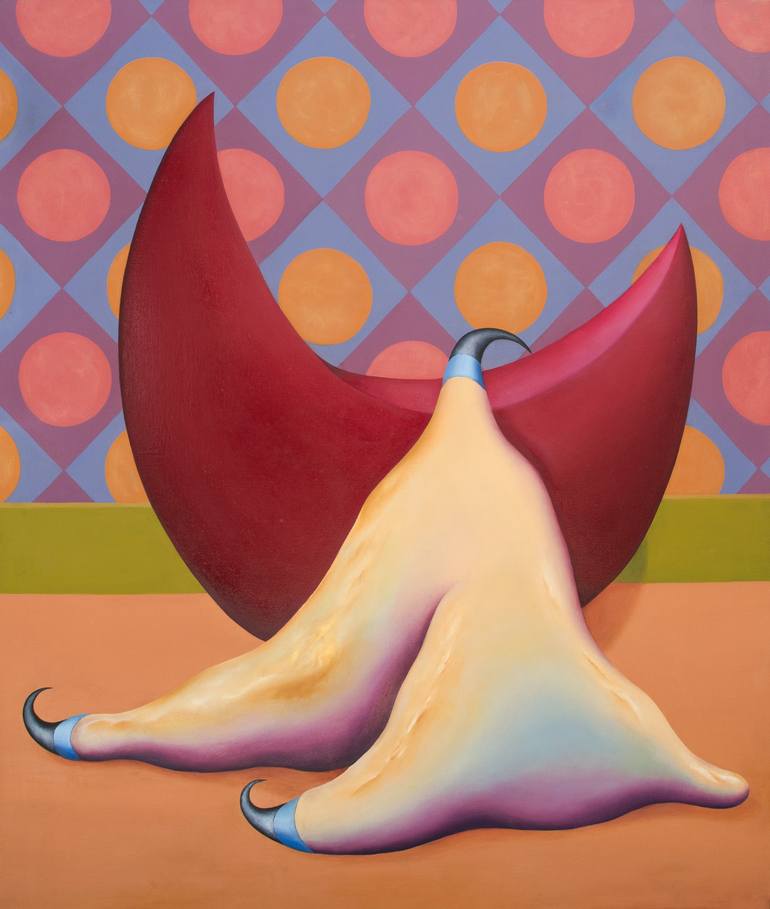 This oil on canvas from 1972 is now available as a print on canvas or fine art paper. It was inspired by the world of the Arabian Nights, this work presents a biomorphic creation poised in front of an op art background.