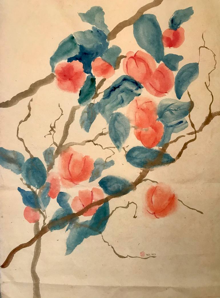 I first saw a persimmon tree at someone's backyard garden in a gloomy winter day. The orangish red color fruit immediately attracted me. The little fire-like spots warmed me in that very foggy afternoon and have brought me hope and peace. I chose zdó paper for this subject for its simplicity and spi...