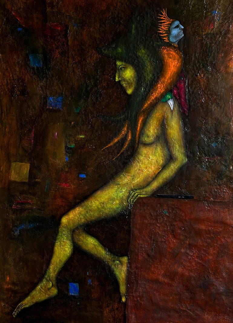 Contemporary figurative oil painting on canvas of a person in a meditative state with a fantastic appearance in yellow tones, on a background of earth tones, with some colors around him. He is accompanied on his journey by fantastic animals and beings. This painting is part of a long series in which...