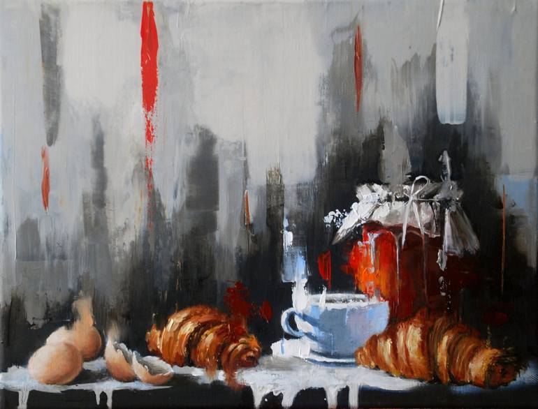 It is a breakfast with croissants, jam and coffee on the menu, a good way to start the day! "Breakfast" is part of a series of still life paintings that allow me to apprehend the poetic dimension of the banality of everyday life. I am very attached to the humble "truth" of everyday life.