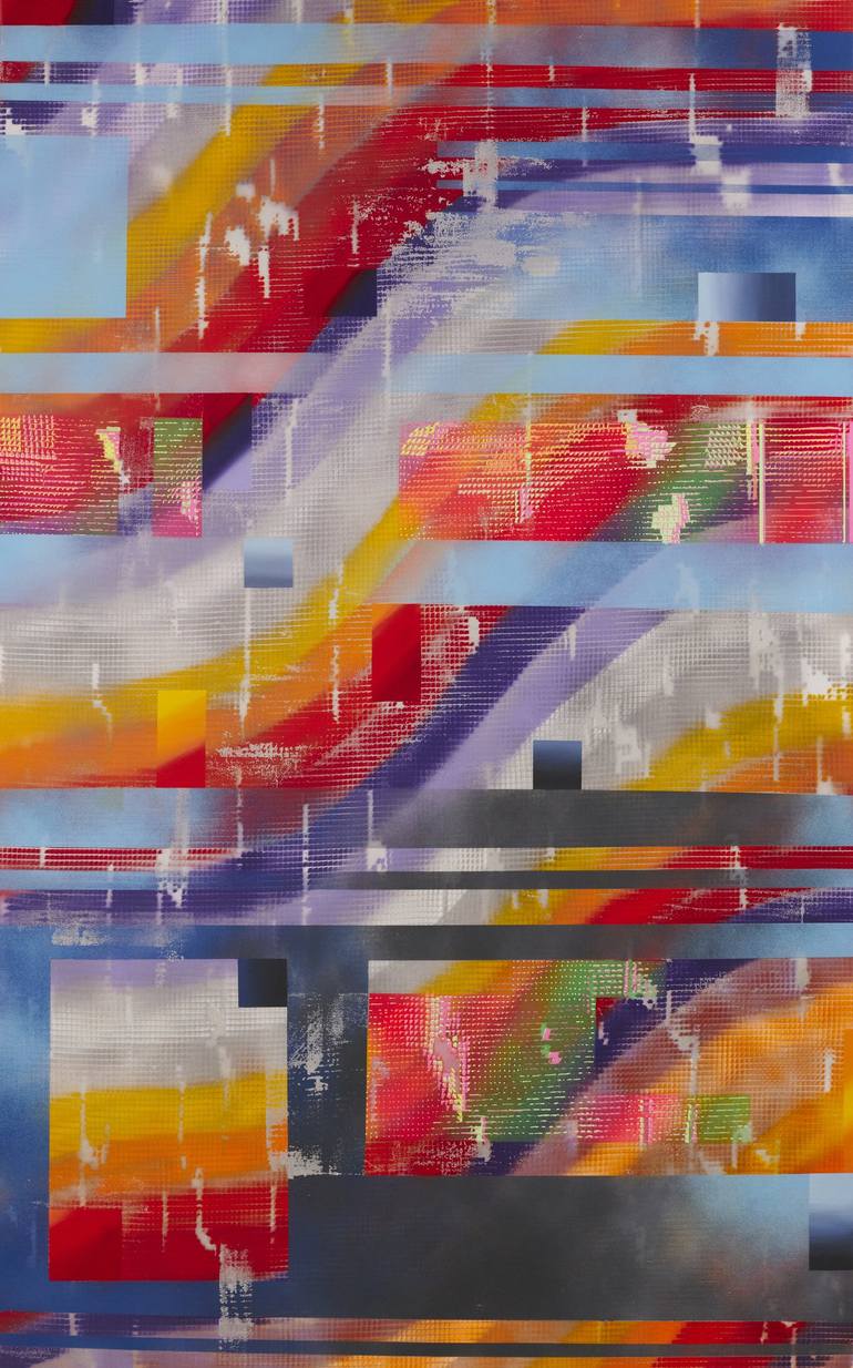 This artwork represents a human experience as it translates to digital data. Through an immersive size and an abstract approach, this piece references the technosphere and the grid-like visual architecture of the web. Intentional scratches of the slick metallic grid and marker painted abstract marks...