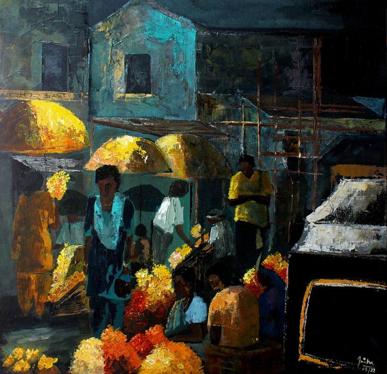 Phool Mandai (Flower Market) depicts a scene from the markets of Pune. Late evening, people are buying flowers because it is the festive time. The yellow of the marigolds shines even as the light goes down. The auto waits as its passenger buys some flowers for the next day. Men and women selling the...