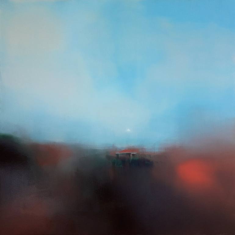I had to crystallize the light at a precise point by depicting a moon or a veiled sun in a paradoxically blue sky and devoid of any cloud disturbance. Its slightly off-centered positioning on the vertical and horizontal axes of the canvas prevents the gaze from freezing and accentuates the idea of a...