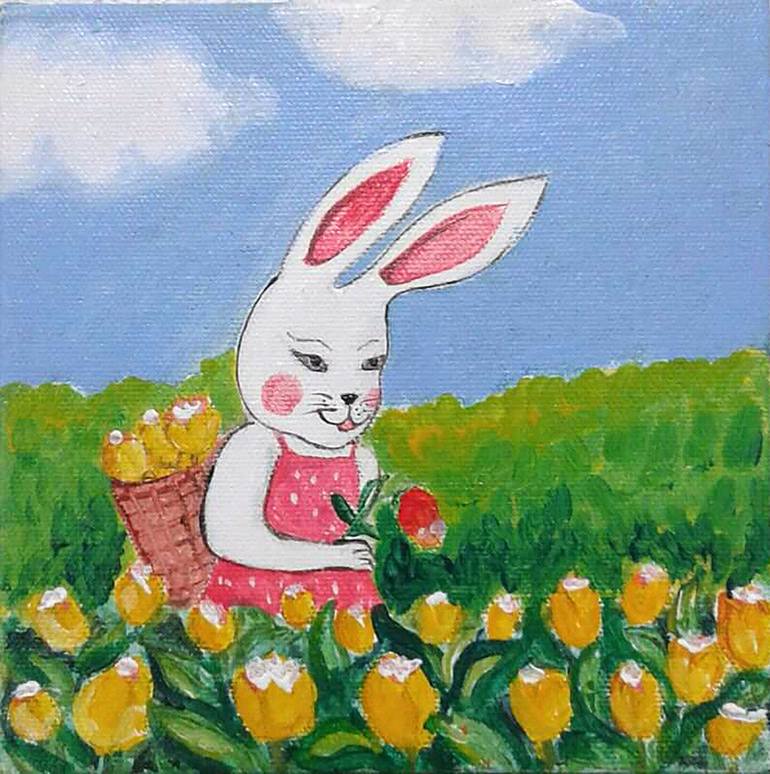 The artist has portrayed a cartoon version of real animals… A rabbit is seen with a basket on her back, she is in a tulip field and it is filled with beautiful yellow flowers! She collects them one by one… The painting is captivating for the young ones… The colors are bold and bright! 30500-CU-NID