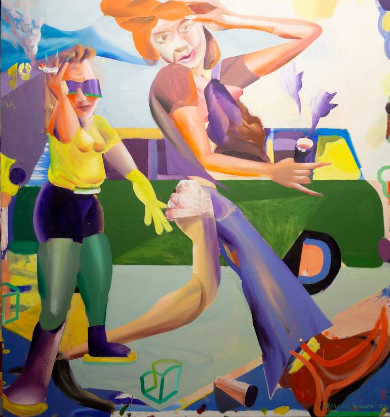a painting with two women and a green Volkswagen cucumber - the idea for the painting arose during a visit to Berlin. This is a kind of snapshot from a walk. Berlin is full of people: different, colorful, not entirely polite :) Strong colors and expressive.