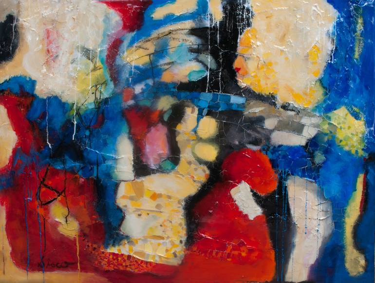 38 1/2" x 50 1/2" Oil and texture on wood panel then coated with high gloss resin. This work of art is beautifully framed in a black lacquer floating frame. The texturing creates a mosaic effect and the high gloss resin gives the painting the illusion of being suspended. This painting tells a stor...