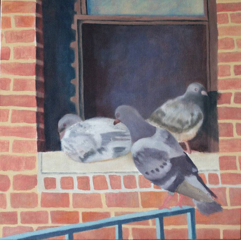 I looked out my kitchen window one golden summer afternoon and saw these three pigeons sitting on the bathroom window of the apartment opposite mine. I liked the pose of the birds, and I liked the earth colors of the scene, I rarely paint in earth colors. I also wanted the challenge of painting bi...