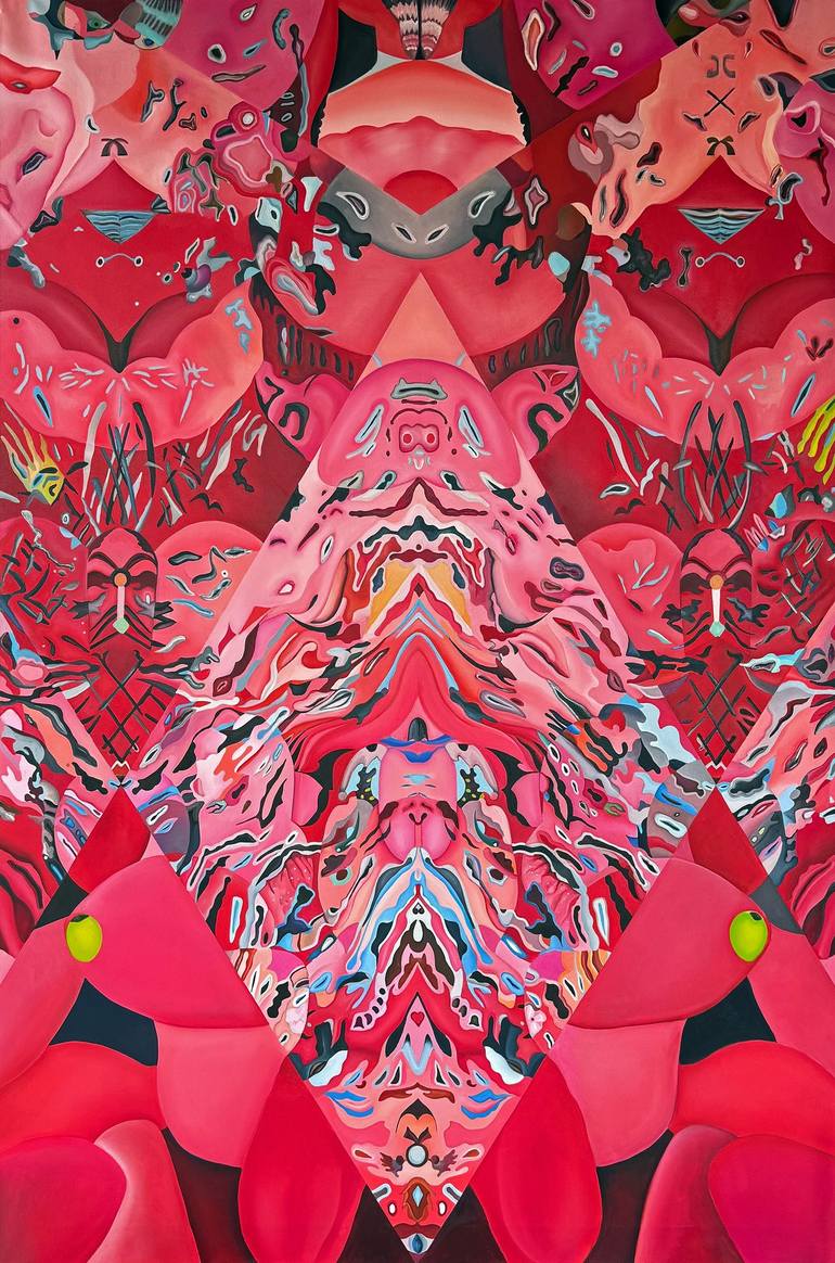 "Piglet Reverie" (2025) is an imaginative and vibrant oil painting that merges surrealism with abstraction. The composition features intricate, mirrored patterns that evoke the shape and essence of a pig, with a dominant palette of pinks and reds, symbolizing vitality and warmth. The style is richl...