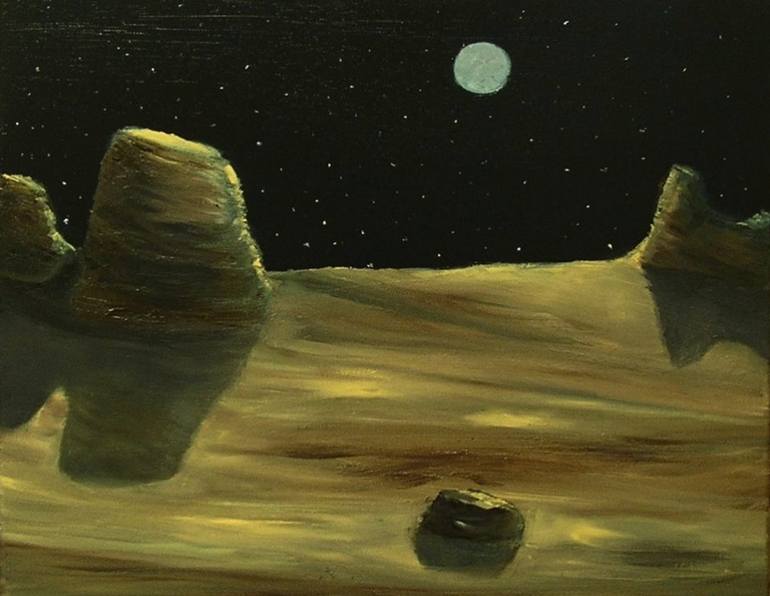 A surrealistic depiction of a full moon rising over a sandstone landscape of the desert southwest.
