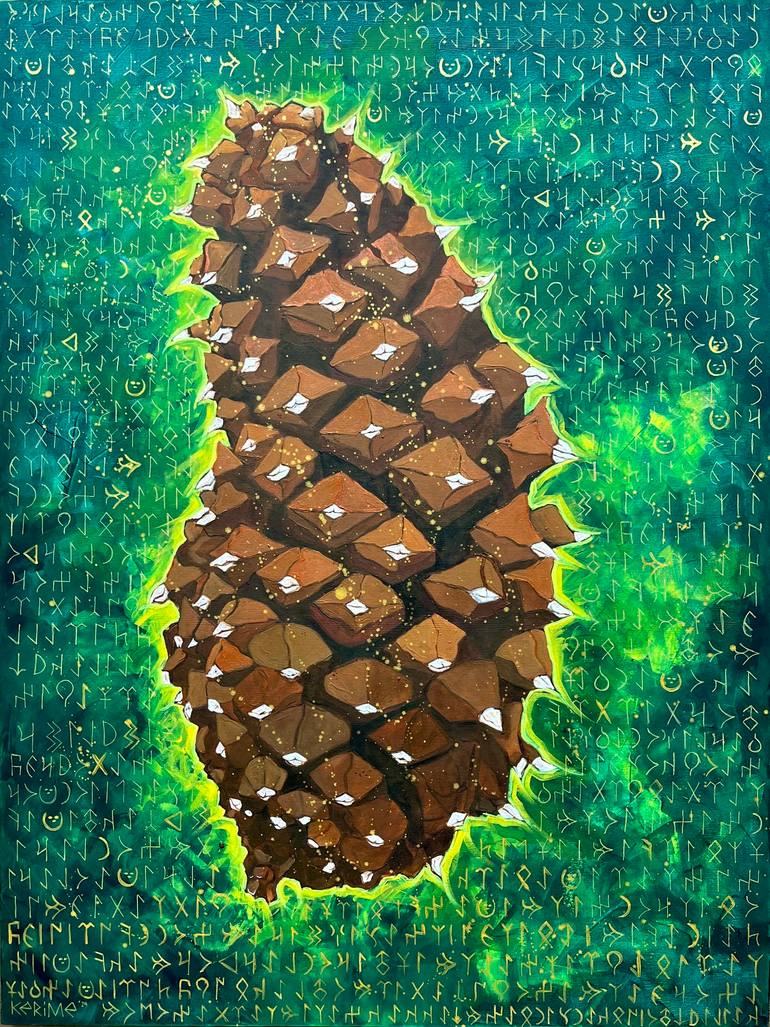 Original Acrylic Painting "Pine Cone Opened" by Kerime Elibuyuk, September 2024, Istanbul. "The pine cone I used as a model in my previous painting, 100x70 cm Pine Cone, opened over time. I wanted to paint it too. Pine cones have deep symbolic meanings in many cultures and beliefs. What impressed m...