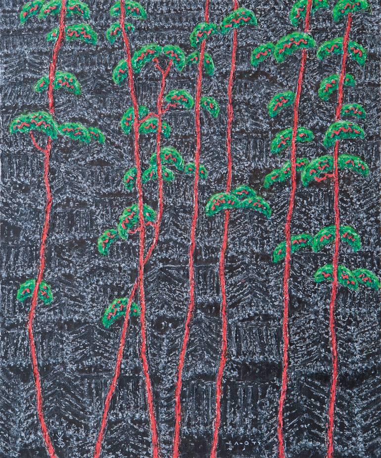 I am an artist, paint Korean pine trees and landscapes. I depict tree trunks that are bent and red, symbolizing their strong vitality in harsh environments. They thrive despite cracks in the rock and heavy weather, mirroring the resilience of human lives.