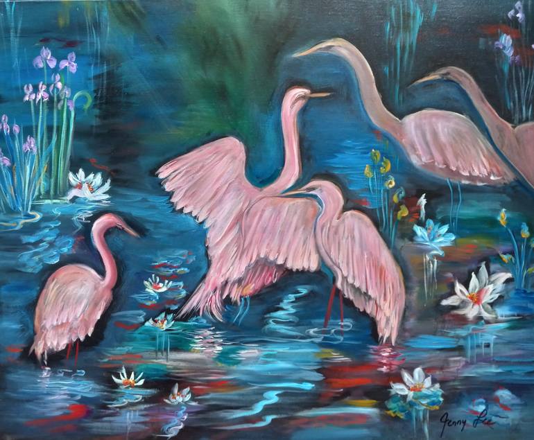 Frolicking pink egrets on the misty pond reminiscent of Monet art. Pink feathered friends feeding on whatever on Monet's pond. Original oil painting on stretched canvas hand made, one of a kind. This painting comes with a Certificate of Authenticity signed by the artist