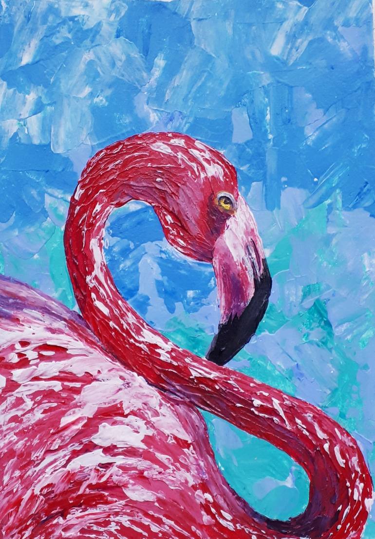 Flamingo is an original painting by Tatiana Orlovetskaya. The painting was painted in 2021, in excellent condition. For my work on this painting, I used professional oil paints, primed cardboard, palette knife and artistic varnish to protect the paint layer. Author's signature on the back of the pai...