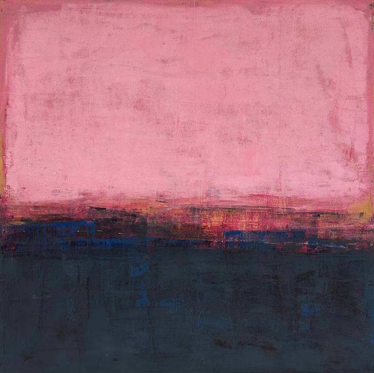 Working in my studio, scraping paint, the pink just started seeping through. More and more pink! The landscape grew out of my desire to see what would appear from below.