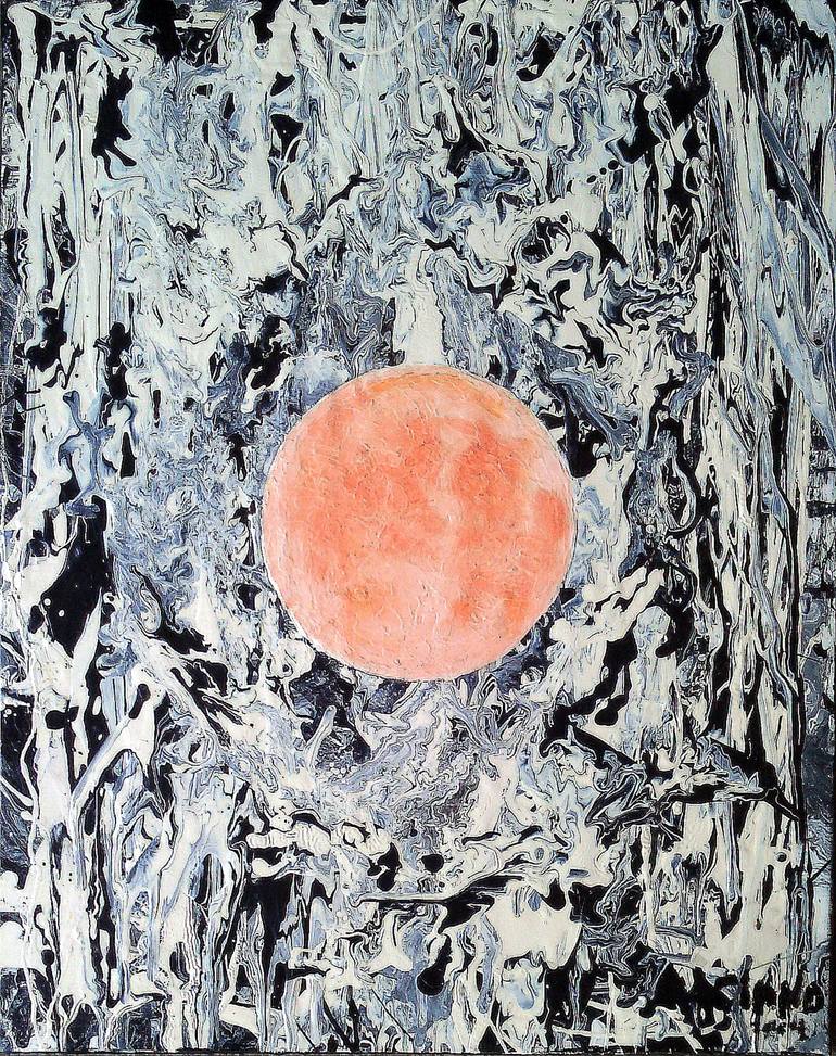 This is an representational painting of a pink full moon.