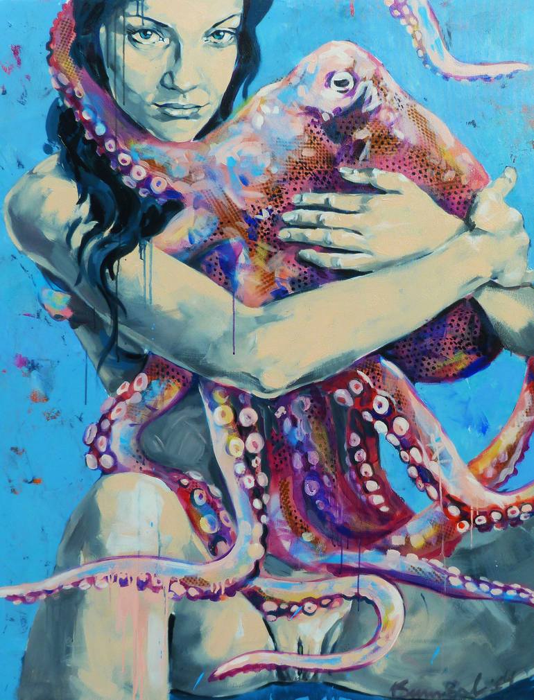 Pink octopus are very loving animals. With this picture recreate the love between a woman and her octopus