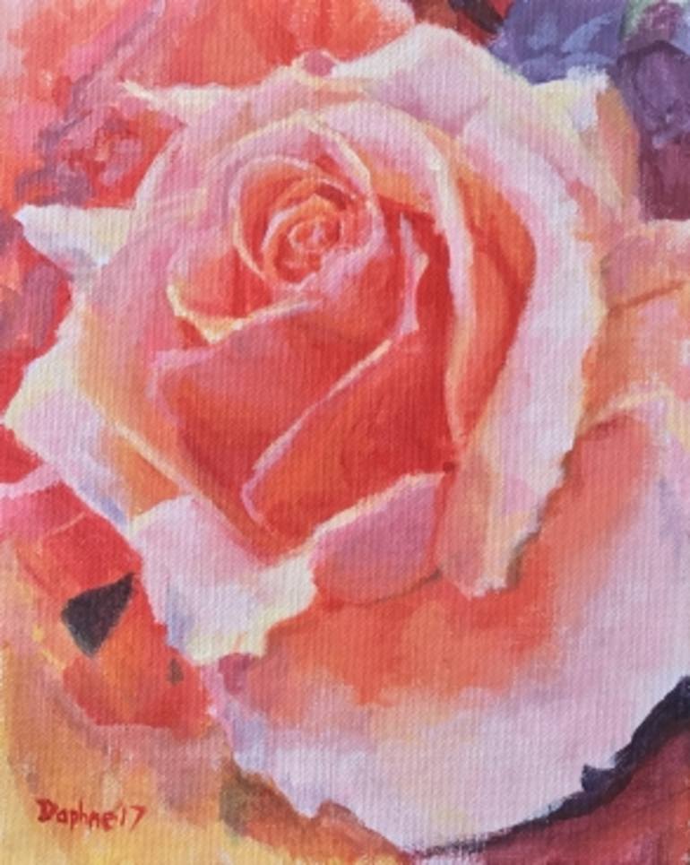 This rose painting is done using a limited pallet of only ultramarine blue, cadmium red, cadmium yellow, and titanium white. I started this rose painting as a demo in an acrylic floral painting workshop I was instructing. I was inspired by the warm glow of this rose blossom and continued the paintin...