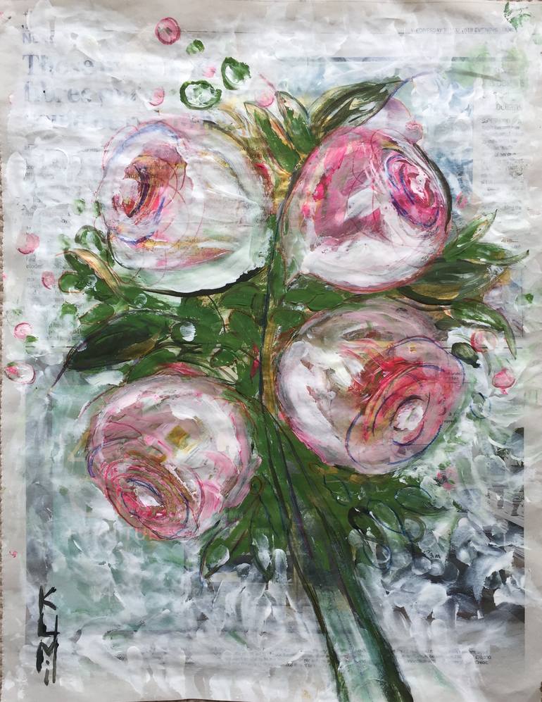 Pink Roses I - acrylic on newspaper size 37x29cm or 15"x11". Painting in acrylic over a newspaper, inspired by our beautiful garden and the pink roses there. All of my paintings are one of a kind original artwork so when you buy from me you can buy with confidence that you will own something unique...