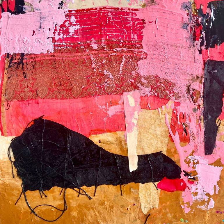 "Everything Abstract" juried online exhibition December 2024. Finalist Award for this mixed media painting. This original abstract mixed media painting uses a pink silk scarf, Thai black paper which has string incorporated into the texture, acrylic paint and art papers on canvas. The sides of the ca...