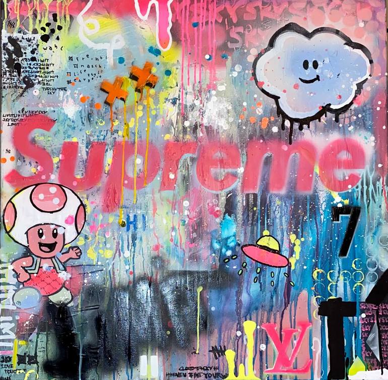 The work "Pink Sky" is made of canvas and some collage elements (hand drawn acrylic figures). I love the different structures and the feel of this picture. The paint is acrylic, spraypaint, chalk & permanent marker. The work is characterized by intense colors and exudes a certain lightness. It is de...