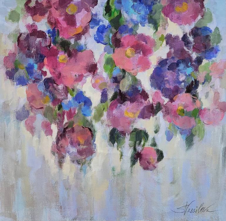 Inspired by the English Gardens, the painting is an expression of spring. The color palette is fresh and warm - pink and purple interacting with cool blue and green on a white, airy background. Painted very loosely, with bold brushstrokes and playful lines, this artwork is a statement-making peace i...