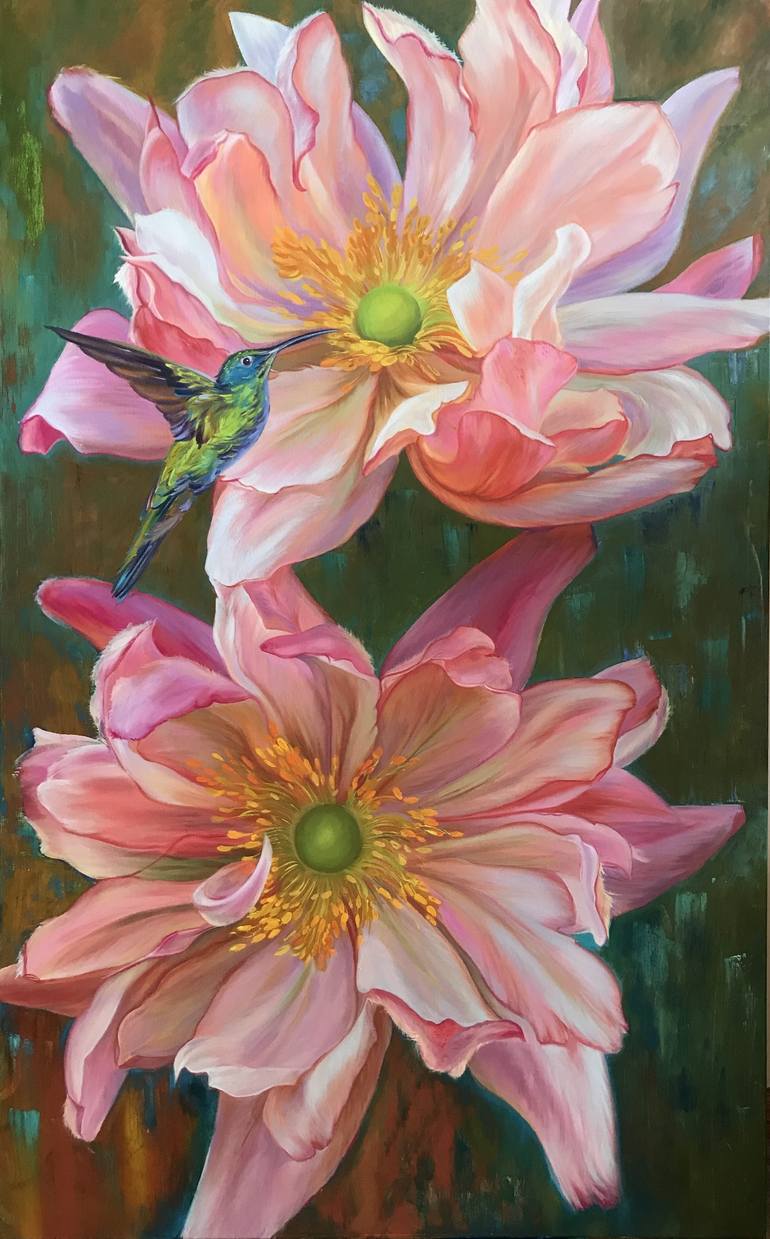 Pink anemones on a contrasting background. Year of creation 2020 The Latin name of the genus Anemone goes back to antiquity. The plant is associated with the Greek word anemos – wind. The plant is also called anemone.