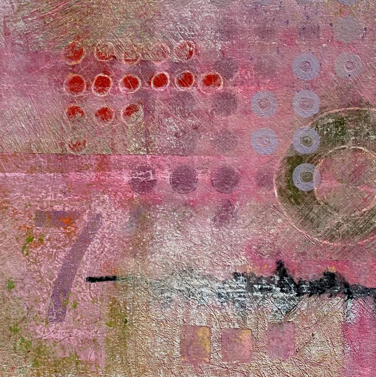 This artwork was created with cold wax medium, oil paint and pastel on gessoed paper. The piece is 9 x 9 inches, framed with shadow-box mat and anti-reflective glass. There are 3 other similar pieces, each features a number from 7 to 10. Fanciful pinwheels, dot patterns and circles predominate this ...