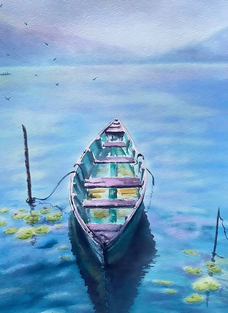 Imagine a watercolor landscape, as if painted with the lightest touch of a dream. In the foreground is a small boat, tinted in gentle turquoise and pink-peach hues, as though it has absorbed the colors of the sunset. It drifts quietly by the shore, moored to a wooden stake. The lake is mirror-like a...