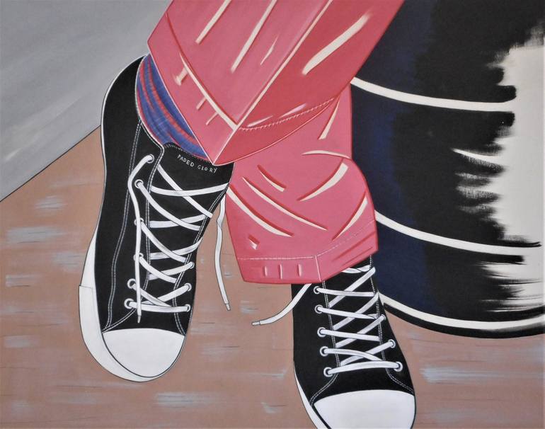 a painting of pink pants with converse sneakers.man leaning against a barrel. this is apart of series of sneakers.