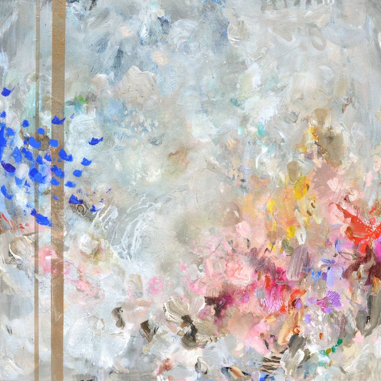 This playful piece is a non-objective and intuitive mixed-media painting (acrylic, gouache, ink, charcoal, crayon, marker, etc) on a 1.5" gallery wrapped canvas. There are lots of layers and the graphic stripes are a translucent metallic gold. The sides are painted grey and comes ready to hang. Si...