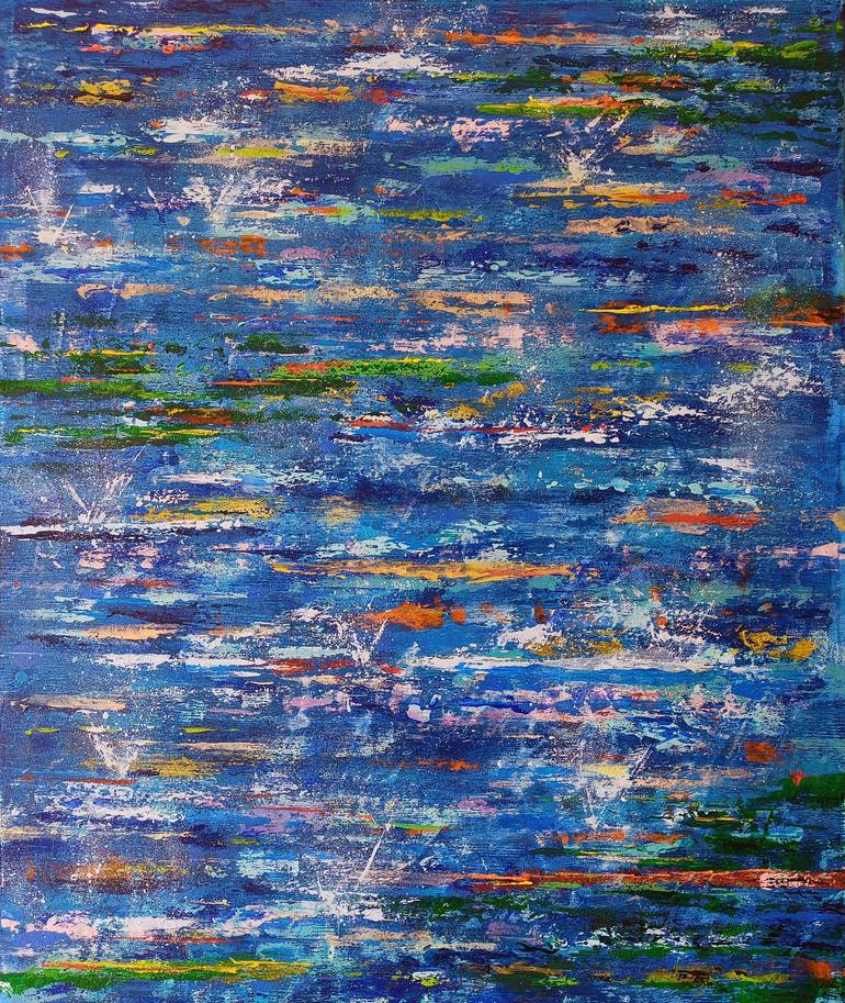 I painted in shades of blue and light blue, enlivened by details in contrasting warm colors, evoking a moment of light summer rain on a pond, with drops creating delicate splashes on the surface of the water. Subtle accents in gold warm up the whole scene. An impressionistic atmosphere that crystal...