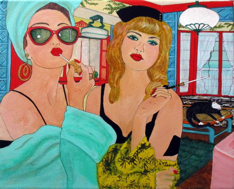 The most important element in anything I create is color and its relationships. My figurative work appropriates and juxtaposes imagery and ideas from American culture. My imagination is stimulated by what I see and hear on the internet. My paintings are sometimes parodies depicting scenes that can be suggestive, ambiguous, and disconcerting. Favorite settings for these scenarios are bathrooms, kitchens and hotel rooms. Common motifs are checked floors, cigarette holders and cigarettes. I enjoy using irrational perspective and color for value. Figures in my paintings are often self-consciously staring out at you the viewer thereby including you in a scenario whose meaning is created in your mind, based upon your unique world/societal perspective. Most of my paintings are small in size and intended for small, intimate spaces. Since receiving a BA in Art from the University of Hawaii-Hilo, my artwork has been exhibited in solo and group shows in the United States; Amsterdam, The Netherlands; Paris, France; London, England; and is in private collections in 50 states and 16 countries. Favorite mediums are oil, acrylic, watercolor, and ink.