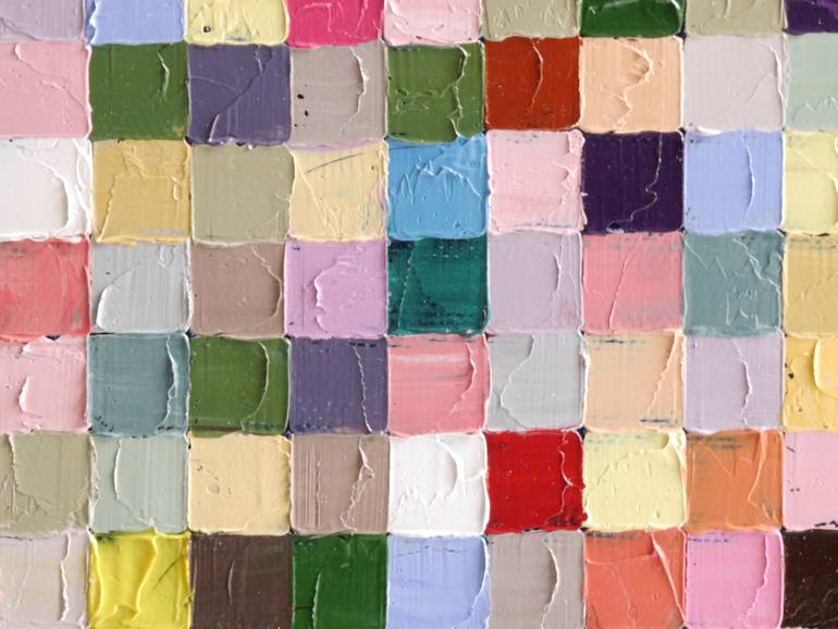 Brightly coloured process painting made up of 1cm squares of oil paint applied adjacent to each other in a strict grid pattern. Made up of hundreds of tiny carefully applied squares of contrasting colour blocking this vibrant piece features highly detailed transitions from blue to red to green and ...