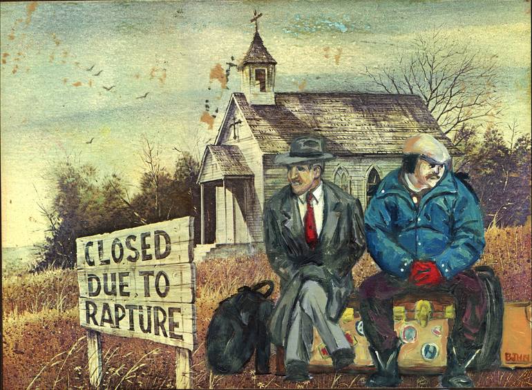 This altered thrift store painting depicts Steve Martin and John Candy from Planes, Trains, & Automobiles waiting... for a long time.