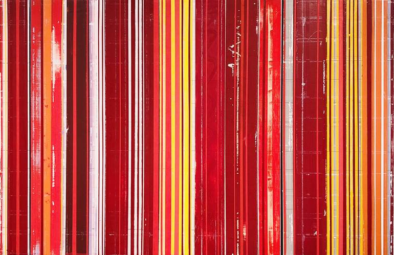 Contemporary stripe painting. Reds, yellows, oranges, whites, blacks grey stripes. Wired and ready to hang. Titled and signed verso. Can be hung vertically or horizontally as you like.