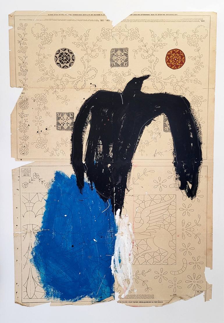 Expressionist gouache painting of a poetic bird made on a vintage french embroidery pattern from 1914. It is attached to a watercolor paper sheet.
