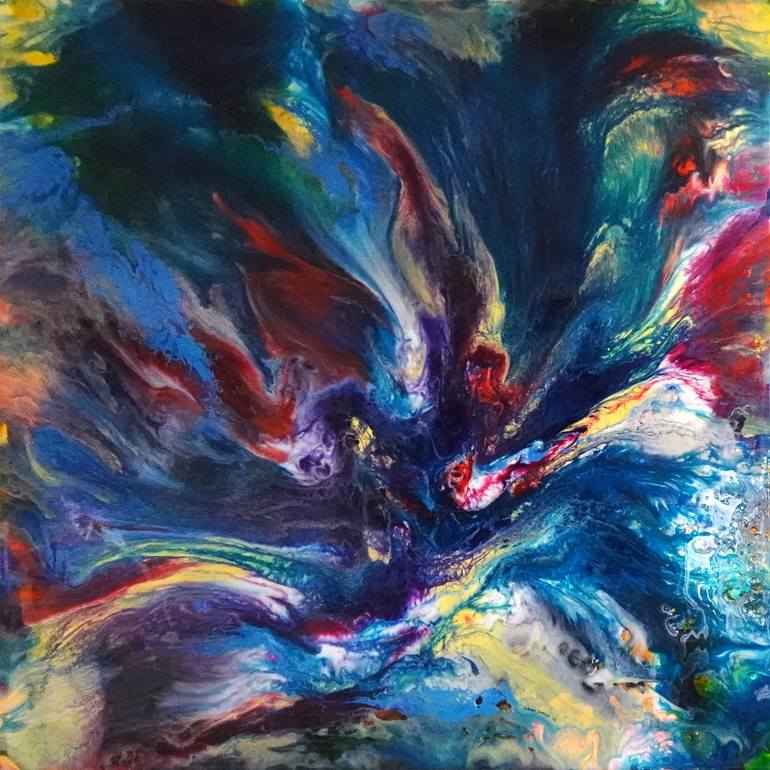 My painting may be described in two words: colour and movement. My work reflects my vision of society and of our world, where nothing stands still, everything is continuously moving. I address this perpetual movement in a very personal and intimate way, through the fluidity of the colour stains that allows me to create characters, scenes and stories designed to engage the viewers emotionally. The mixture of colours resulting from the movement of the medium used gives spontaneity to this painting, where there’s no «safety net» but rather an ever echoing surprise. Although the object of my work may change, colour is always at its centre. I love colour for its powerful symbolism and I use it to convey emotion. Sometimes I start one work already knowing the goal I wish to attain, other times I follow the emotions that unfold along the process. With this very fluid technique there is no absolute control over the results, and I receive that final surprise gratefully. With my abstract painting I wish to create connections with the viewer, allow him or her to feel the pleasure and the joy of discovery in a sea of coloured spots, to be surprised by each line of contour, patch of colour or transparency, and in this way connecting emotionally with the work of art.
