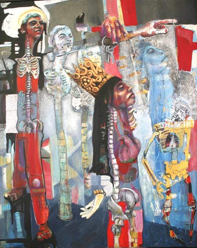 Born on the Day of the Dead in Houston, Texas, Jacob Medina is an artist of Mexican descent living on the Big Island of Hawai’i. After serving in the Army with stints to Macedonia, Kosovo, and Germany he received his BA in Art in 2007 from the University of Hawai’i. Jacob’s work can be described as Primitive Pop, where Mexican imagery meets Hawaiian legend. Icons from tiki to Day of the Dead themes mingle with pop culture into mythical scenarios. His whimsical characters are placed into a variety of environments and each painting tells a unique story that offers an escape to a faraway paradise. His work celebrates the idea of life after death revered through the Mexican holiday “El Dia de los Muertos”. His paintings are cultural cocktails that portray the ever changing identity of people who come from a multitude of traditions and places. He works primarily with acrylic paint and builds many layers to create form through light and shadow. His figures are often enhanced with enamel paint to give them a distinct separation from the background, a technique commonly found in animation and comic book illustrations. Once a painting is finished he builds a custom frame that often reflects the subject of the piece.