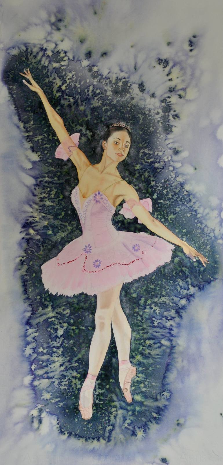 Beautiful Ballerina posing En Pointe. She is embellished with glitter and sequins on her dress and surrounded by an abstract swirling background. This painting is framed without glass. The watercolour has a UV protective coating applied for longevity.